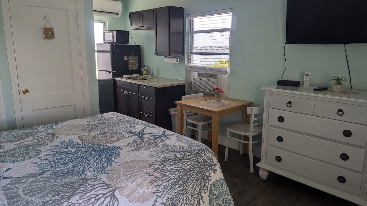 Quaint and cute motel. Old motel. Low on frills but high on convenience, location, price and beautiful bay view. My hubby enjoyed fishing from the private dock.My highlight is I got to see three dolphins during our stay. Once early in the morning and later in the evening. It’s located on the bay side and the ocean side for the beach is literally across the street. Convenient to the grocery store and restaurants. Enjoyed the convenience of a full size fridge and microwave for quick snacks and drinks. The hotel manager, Maria was super sweet and made our stay enjoyable.